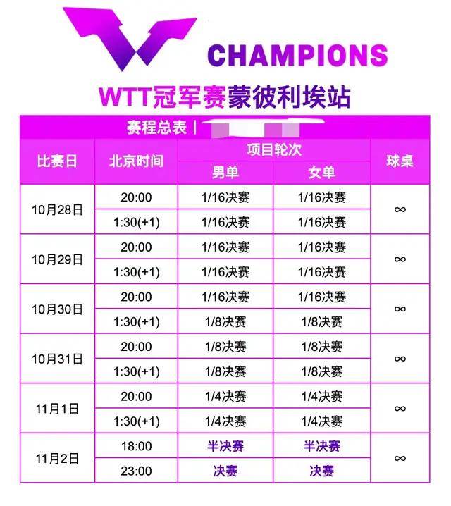 北京时间10月28日讯,WTT冠军赛蒙彼利埃站今日正式揭幕。受时差影响,本次赛事将于北京时间晚间20点打响,分为两个时段进行,第二时段的比赛将在凌晨1点30分进行。